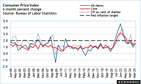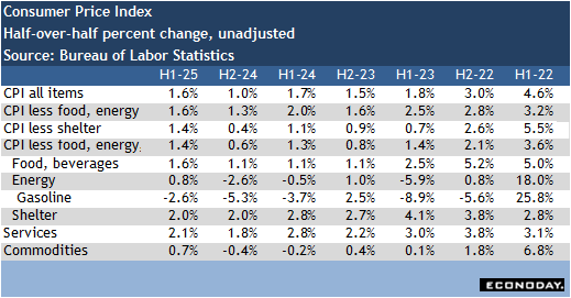 O aumento de seis meses no CPI de todos os itens é de 1,6 % no primeiro semestre de 2025, acima de 1,0 % no segundo semestre de 2024 e quase de volta ao 1,7 % na primeira metade de 2024. O CPI central aumentou 1,6 % na primeira metade de 2025 em comparação a 1,3 e acima de 2,0 % no segundo e no segundo tempo.