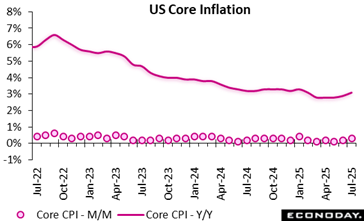 O CPI CPI, excluindo os preços de alimentos e energia, aumentou 0,3 %, após subir 0,2 % em junho e +0,1 % em maio. Os preços dos consumidores menos alimentos e energia saltaram 3,1 % em relação a julho de 2024, após um aumento de 2,9 % em junho e 3 % esperados na pesquisa Econoday.