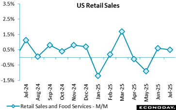 As vendas no varejo de julho dos EUA aumentaram 0,5 %, com base no aumento da revisão mensal de 0,9 % em junho (anteriormente +0,6 %) e conforme o esperado pelo consenso na pesquisa Econoday de analistas.