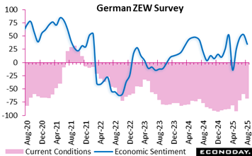 O humor econômico da Alemanha escureceu em agosto de 2025, com o indicador de sentimento econômico caindo para 34,7, abaixo de 18 pontos a partir de julho. Isso marca uma quebra na tendência ascendente de meses, refletindo o crescente desconforto entre os especialistas do mercado financeiro. A avaliação da situação atual passou ainda mais em território negativo em menos de 68,6,6, impulsionado por fracas pressões específicas do segundo trimestre e pressões específicas do setor.