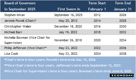 Primeiro, a confirmação extraordinariamente rápida de Stephen Miran como governador do Fed e seu juramento ocorreu antes do início da reunião na terça -feira. Miran é nomeado para concluir o termo que termina em 31 de janeiro de 2026, que foi desocupado cedo por Adriana Kugler. Pode -se inferir que seu tempo no conselho será intencionalmente curto, pois sua confirmação não incluiu uma recondução ao novo termo quando o atual expirar. Isso deixa o presidente Trump com a opção nomeando outra pessoa para o termo a partir de 1º de fevereiro de 2026 e que vai até 31 de janeiro de 2040. Miran se junta a outros dois nomeados Trump no conselho – o governador Christopher Waller e vice -presidente de supervisão Michelle Bowman.