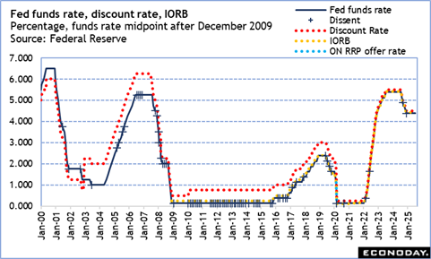Se a maioria dos eleitores do FOMC favorecerá um corte de 25 pontos de base nesta reunião, como é amplamente esperado, isso levanta uma possibilidade distinta de outra dissidência na votação. Na reunião anterior, Waller e Bowman discordaram em favor de um corte de 25-Basis contra a maioria por nenhuma mudança na faixa de taxa-alvo dos fundos do Fed de 4,25-4,50 %. Não seria surpresa se Waller, Bowman e/ou Miran preferirem um ponto de 50-Basis cortado nesta reunião. Não está fora do reino da possibilidade que um, dois ou os três prefira um corte de 75-Basis.