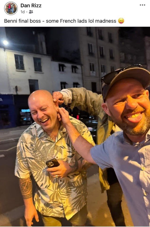 Mais tarde, uma foto postada na mídia social mostra o homem careca rindo em uma camisa havaiana quando dois de seus companheiros puxam sua orelha – aparentemente imitando os policiais franceses.