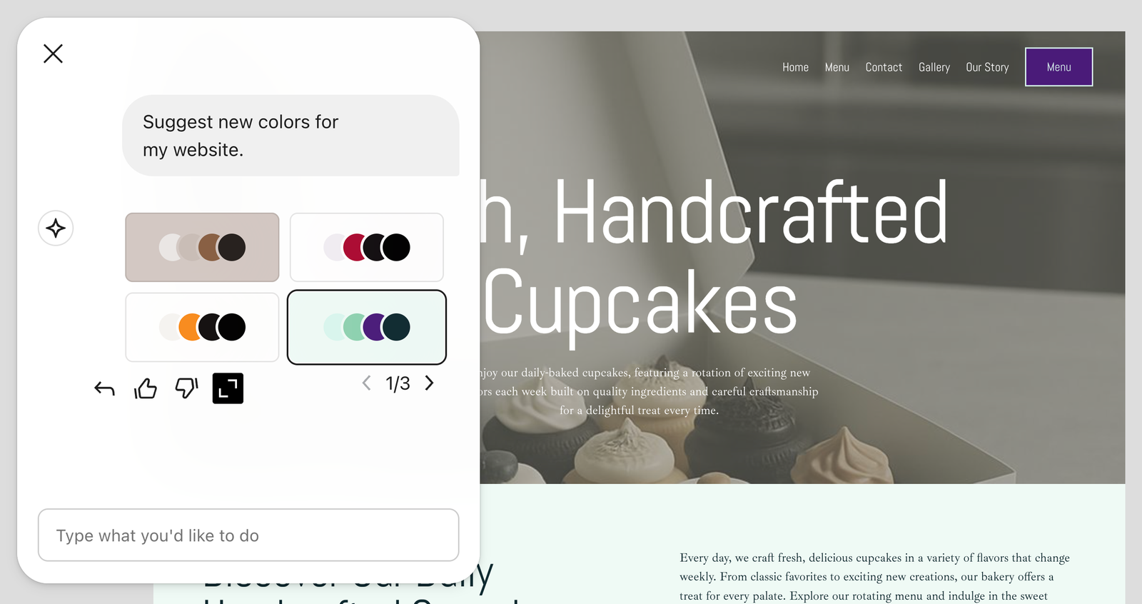 Você pediu mais personalização, então entregamos! O construtor de sites da AI agora oferece uma gama expandida de paletas de cores e pares de fontes com curados designers-gerados instantaneamente para se adequar à sua vibração, estilo ou marca. Personalizar seu site é mais rápido e fácil, seja você quer ousado, mínimo, divertido ou clássico – tudo sem nenhuma experiência de design.