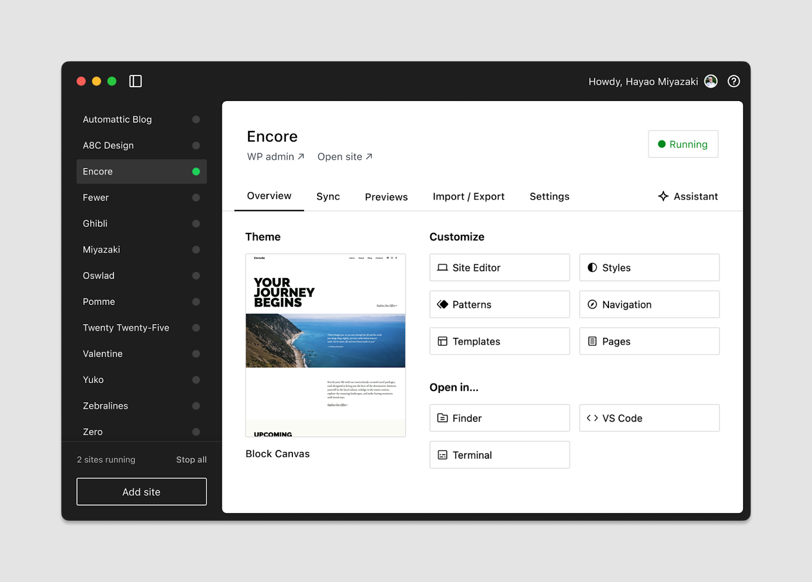 Para criar um site local, lance o estúdio e clique Adicionar site. Você verá uma janela simples, onde pode nomear seu novo site. Depois de entrar em um nome e clicar Adicionar siteO Studio configura automaticamente um ambiente completo do WordPress para você – não é necessário o conhecimento da linha de comando. Uma vez concluído, seu novo site aparece na barra lateral do Studio, fornecendo links convenientes para visualizá -lo no seu navegador ou acessar o painel administrativo do WordPress.