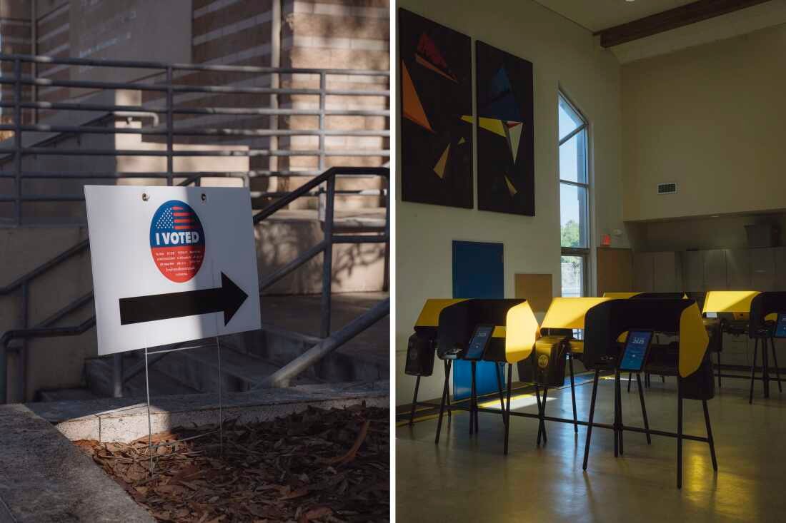 Uma placa de votação e cabines eleitorais são vistas no Oakwood Community Center, no bairro de Venice, em Los Angeles, em 28 de outubro.