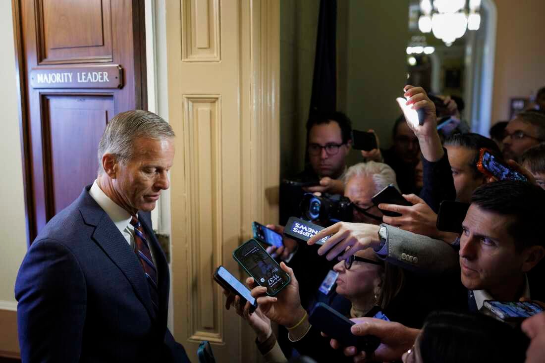 O líder da maioria no Senado, John Thune, R.D., fala aos repórteres enquanto caminha para seu escritório em 10 de novembro de 2025 no Capitólio.