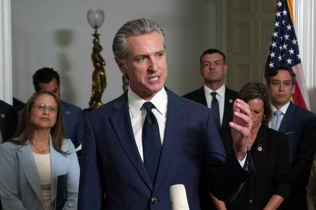 Acompanhado pelos legisladores da Califórnia e do Texas, o governador da Califórnia, Gavin Newsom, fala em apoio aos legisladores democratas do Texas por sua paralisação para bloquear uma votação em um plano de redistribuição do Congresso procurado pelo presidente Donald Trump, durante uma entrevista coletiva em Sacramento, Califórnia, sexta -feira, 8 de agosto de 2025.