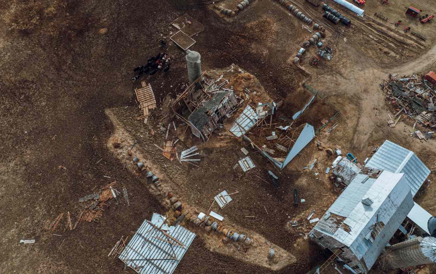 Danos de detritos e tempestades em uma propriedade rural em Edgerton, Wisconsin, depois que ventos poderosos poderosos varreram a área em 15 de março de 2025. O sistema de tempestades, que impactou vários estados no meio-oeste, trouxe ventos prejudiciais, fortes chuvas e quedas de energia generalizadas.(Ross Hurried / Getty Images)