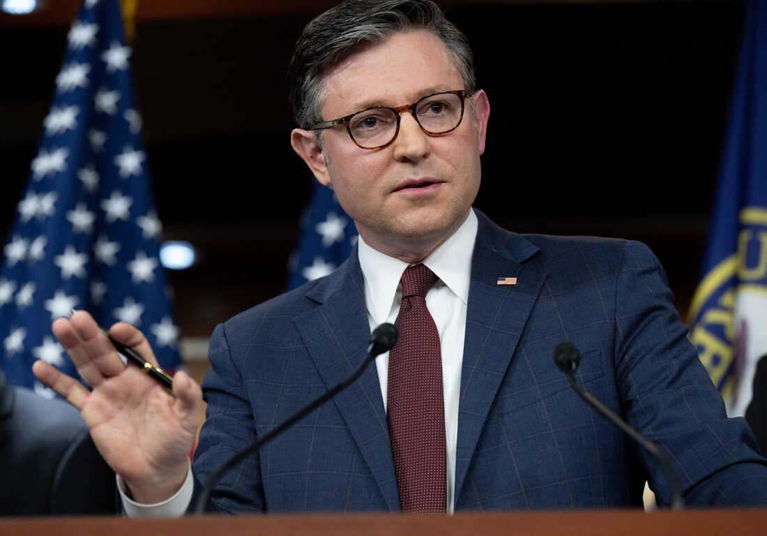 O presidente dos EUA da Câmara, Mike Johnson, republicano da Louisiana, fala durante uma conferência de imprensa sobre o orçamento do republicano da Câmara em 25 de fevereiro de 2025.