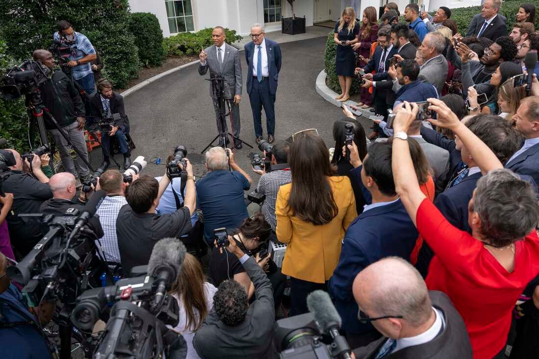 O líder da minoria da Câmara, Hakeem Jeffries, e o líder da minoria do Senado, Chuck Schumer, ambos da cidade de Nova York, conversam com repórteres do lado de fora da Casa Branca na segunda -feira, depois de se encontrarem com a liderança republicana e o presidente dos EUA, Donald Trump. Trump agora congelou US $ 18 bilhões em financiamento de infraestrutura para projetos em Nova York.
