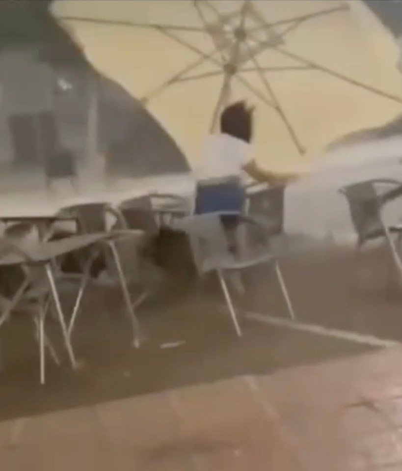 Este é o momento aterrorizante que um tornado de repente varreu mesas e cadeiras em um café turístico na Espanha durante “Satan’s Storm”.