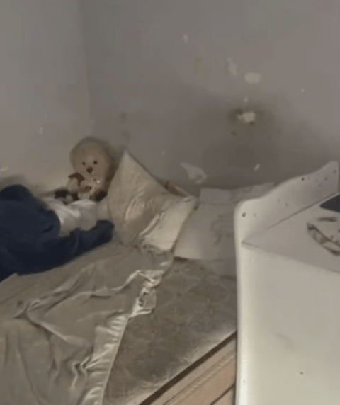Uma foto comovente mostra uma parede manchada com a impressão das costas da garota e um único ursinho de pelúcia de aparência sombria.